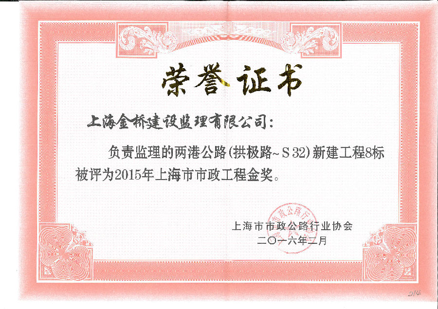 申江路(巨峰路-五洲大道)道路获乐动注册市市政工程金奖
