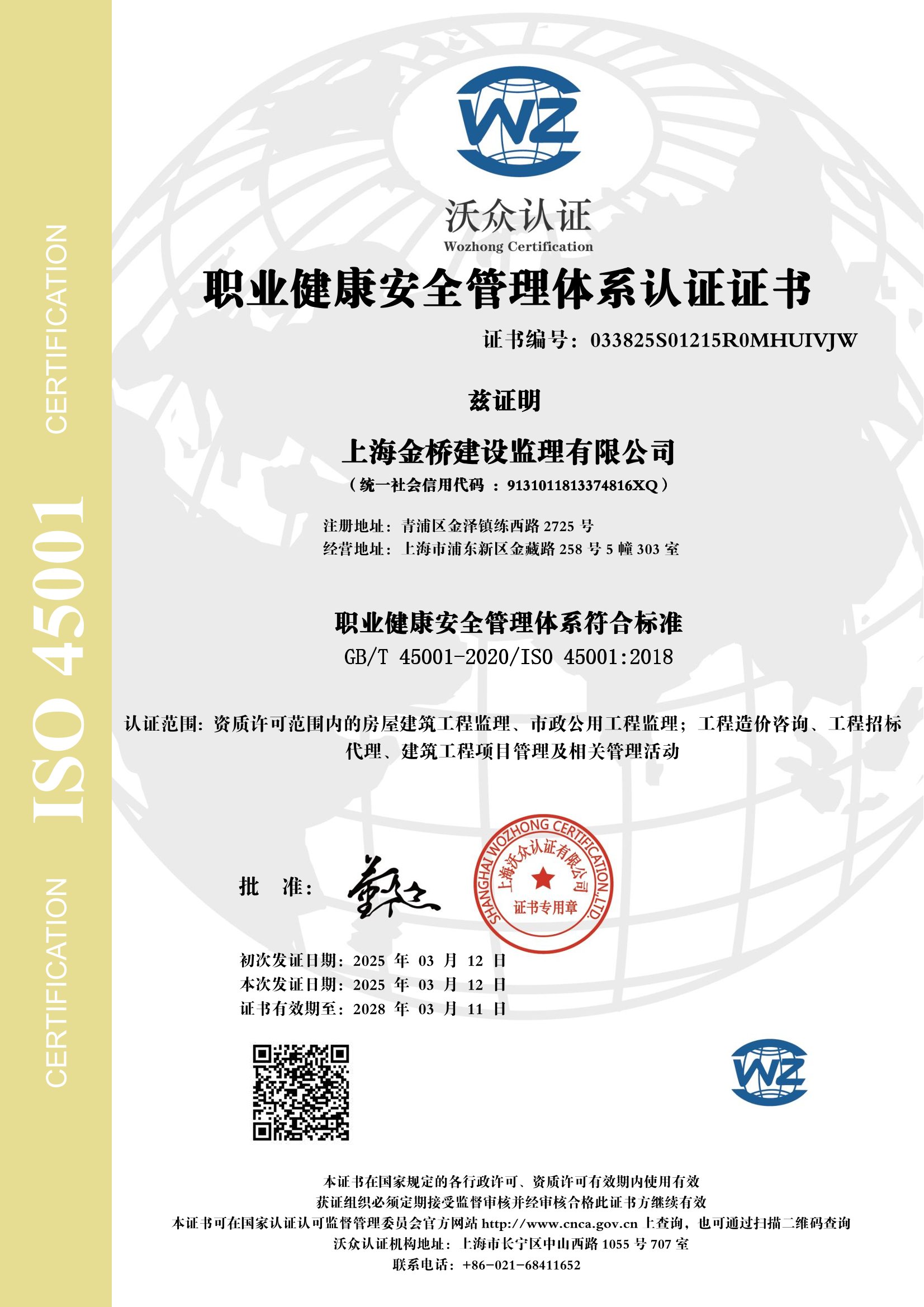 2025年ISO45001职业健康安全管理体系认证证书(中文...
